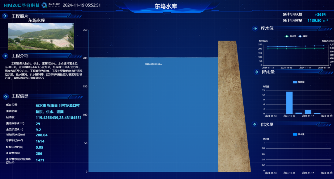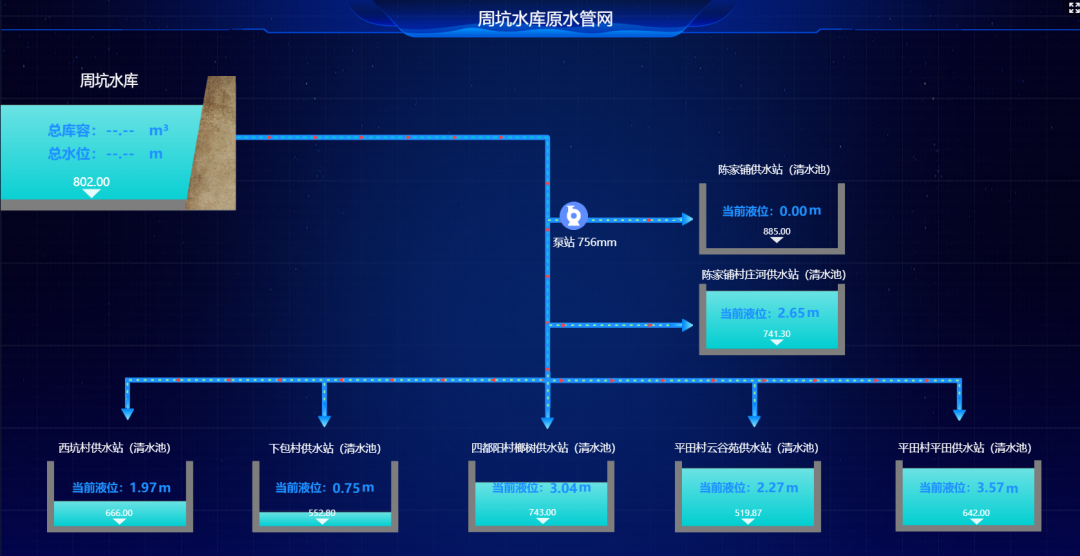 对水源点水位、降雨情况及趋势进行动态监控,对供水管网运行情况进行实时监测调度,主要包括管网用水流量、水池水位信息。