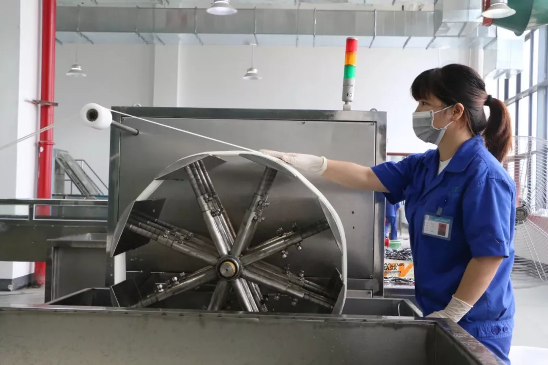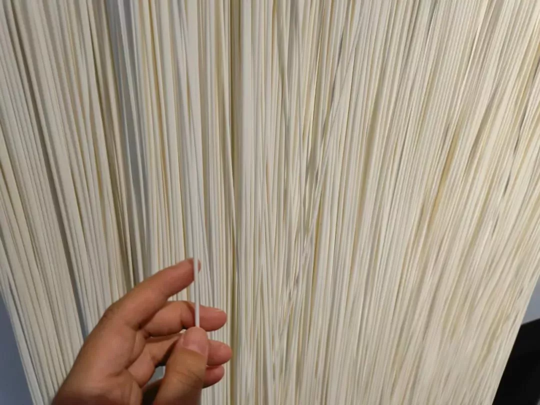 8月19日,在PVDF超滤膜成品区,我们可以看到,一排排超微滤膜像面条一样竖挂在架子上,捏在手中柔韧而有弹性。