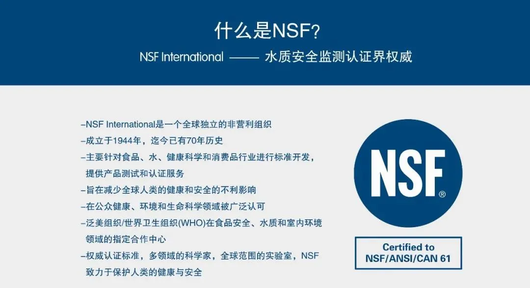 NSF(National Sanitation Foundation) International成立于1944年,是一个全球性的独立公共卫生和安全组织。NSF致力于公共卫生、安全、环境保护领域的标准制订、产品测试和认证服务工作,是公共卫生与安全领域的权威机构。NSF International于2005年和2011年先后成立了其中国地区的业务营运中心: NSF International中国公司(获得了中国认监委的认可)及中国实验室(获得了ISO/IEC 17025认可),协助国内客户符合国际贸易进出口方面的安全、质量、诚信和监管要求。NSF/ANSI/CAN 61建立了大多数饮用水系统部件的健康影响标准,经过此认证可确保产品满足美国和加拿大的监管要求,甚至于许多其他国家的测试要求。