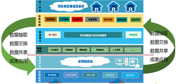 河长制信息化平台包含河长制信息管理系统、智慧河长APP,基于河道网格化管理方式,对省、市、县(区)、乡镇(街道)、村(社区)分级管理,综合应用GIS地理信息系统、移动互联网、卫星定位系统、多媒体、云计算、物联网、大数据等技术,实现河道管理信息静态展现、动态管理、常态跟踪,为落实河长工作的目标管理、任务督办、绩效考核提供抓手,面向各级河长、工作人员、巡查人员、社会公众提供不同层次、不同载体的查询、上报和管理等服务。