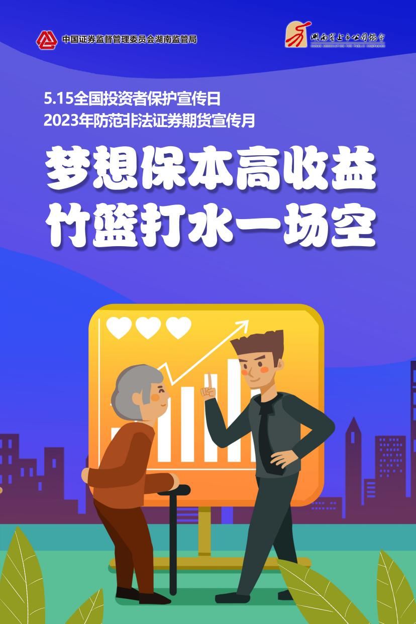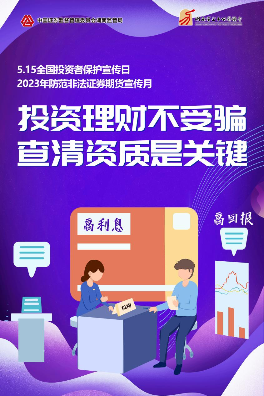 在5月15日“全国投资者保护宣传日”来临之际,根据中国证监会投保局统一安排,在湖南证监局的指导下,开云手机平台_开云(中国)科技将以“心系投资者,携手共行动一一拥抱全面注册制改革,保护投资者合法权益”为主题,开展2023年“5·15 全国投资者保护宣传日”活动,一方面做好全面注册制知识普及、规则讲解和风险揭示等工作;另一方面针对非法证券基金期货活动,强化防非宣传,引导投资者选择正规机构和正规渠道进行投资,减少投资者上当受骗。